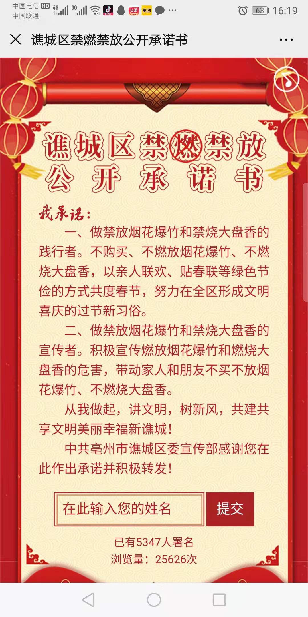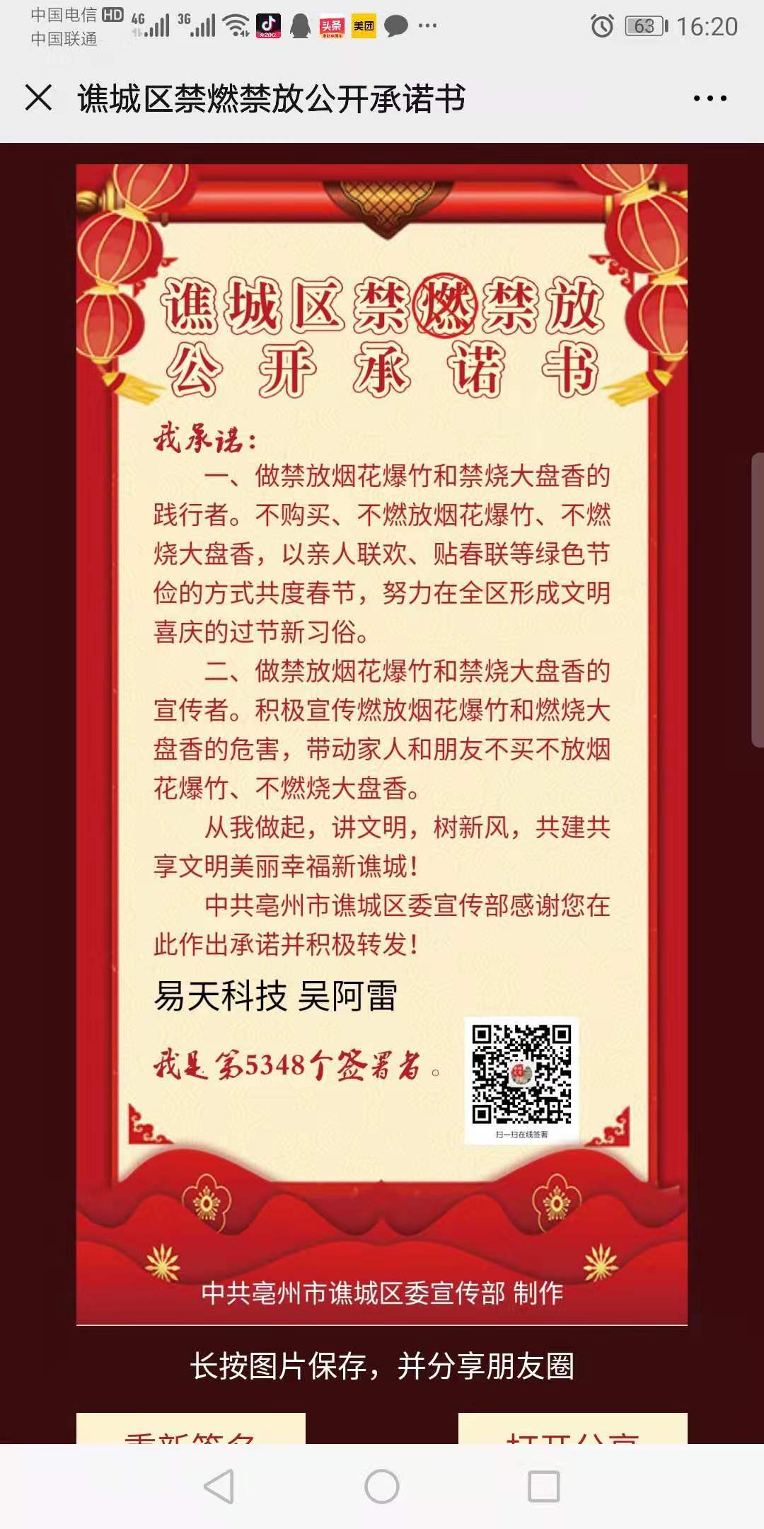 譙城區禁燃禁放公開承諾書我承諾:一、做禁放煙花爆竹和禁燒大盤香的踐行者。不購買、不燃放煙花爆竹、不燃燒大盤香,以親人聯歡、貼春聯等綠色節儉的方式共度春節,努力在全區形成文明喜慶的過節新習俗。二、做禁放煙花爆竹和禁燒大盤香的宣傳者。積極宣傳燃放煙花爆竹和燃燒大盤香的危害,帶動家人和朋友不買不放煙花爆竹、不燃燒大盤香。從我做起,講文明,樹新風,共建共享文明美麗幸福新譙城!譙城區委宣傳部感謝您在此作出承諾并積極轉發??